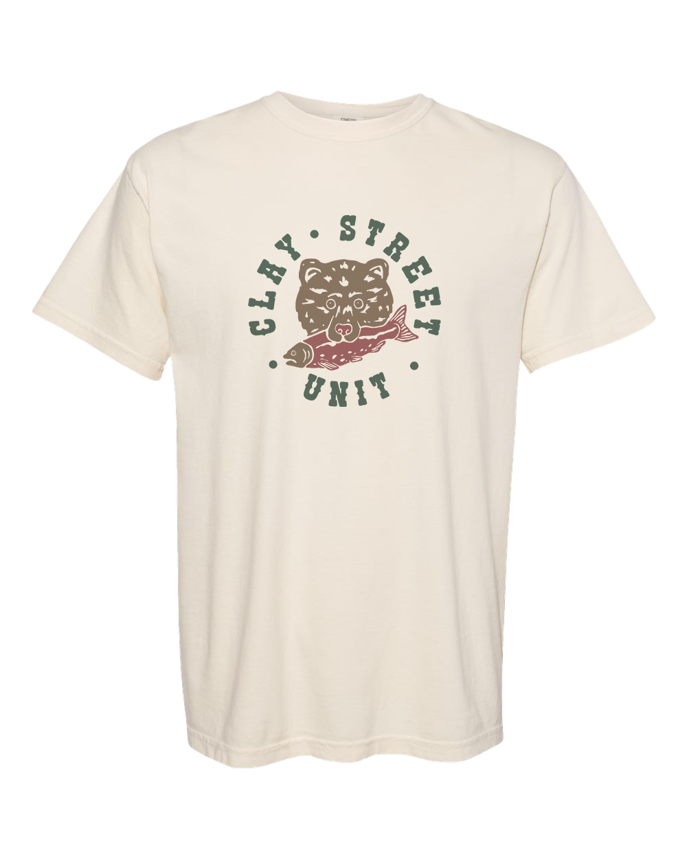 Bear eating a fish printed on a ivory Comfort Colors tee- true to size